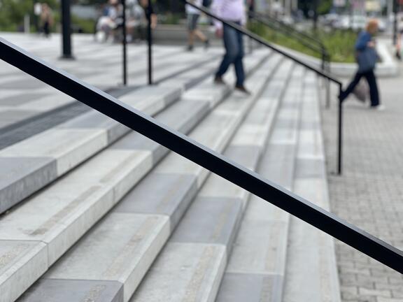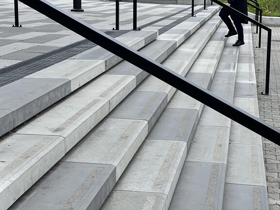 Nowoczesne schody ze zintegrowanym oświetleniem do przestrzeni publicznych. Stopnie L z oświetleniem LED i elementami antypoślizgowymi.